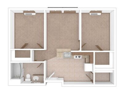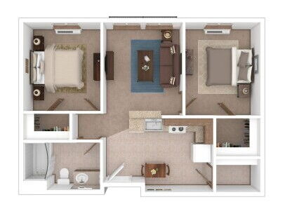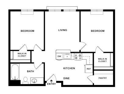 Our two-bedroom Meridian floor plan features walk-in closets, dine-in kitchen, and a pantry.